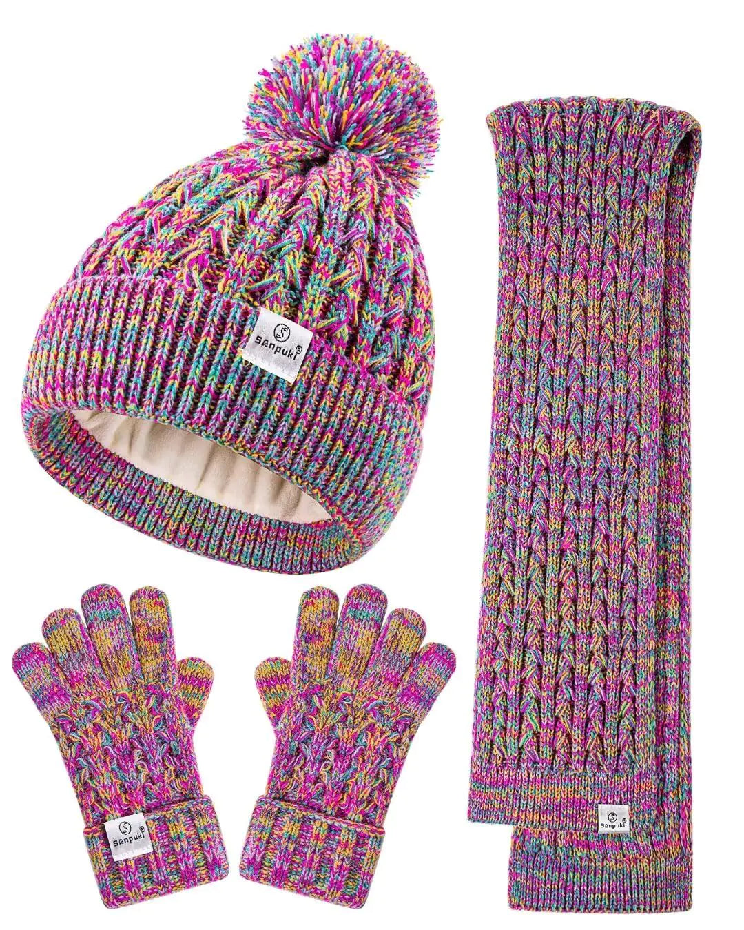 Kids Winter Hat Gloves Scarf SetGirls Toddler Winter Hat Beanies with Pom Neck Warmer Gaiter Mittens Fleece Lined Set Christmas Gift for Kids(Rainbow Mix)